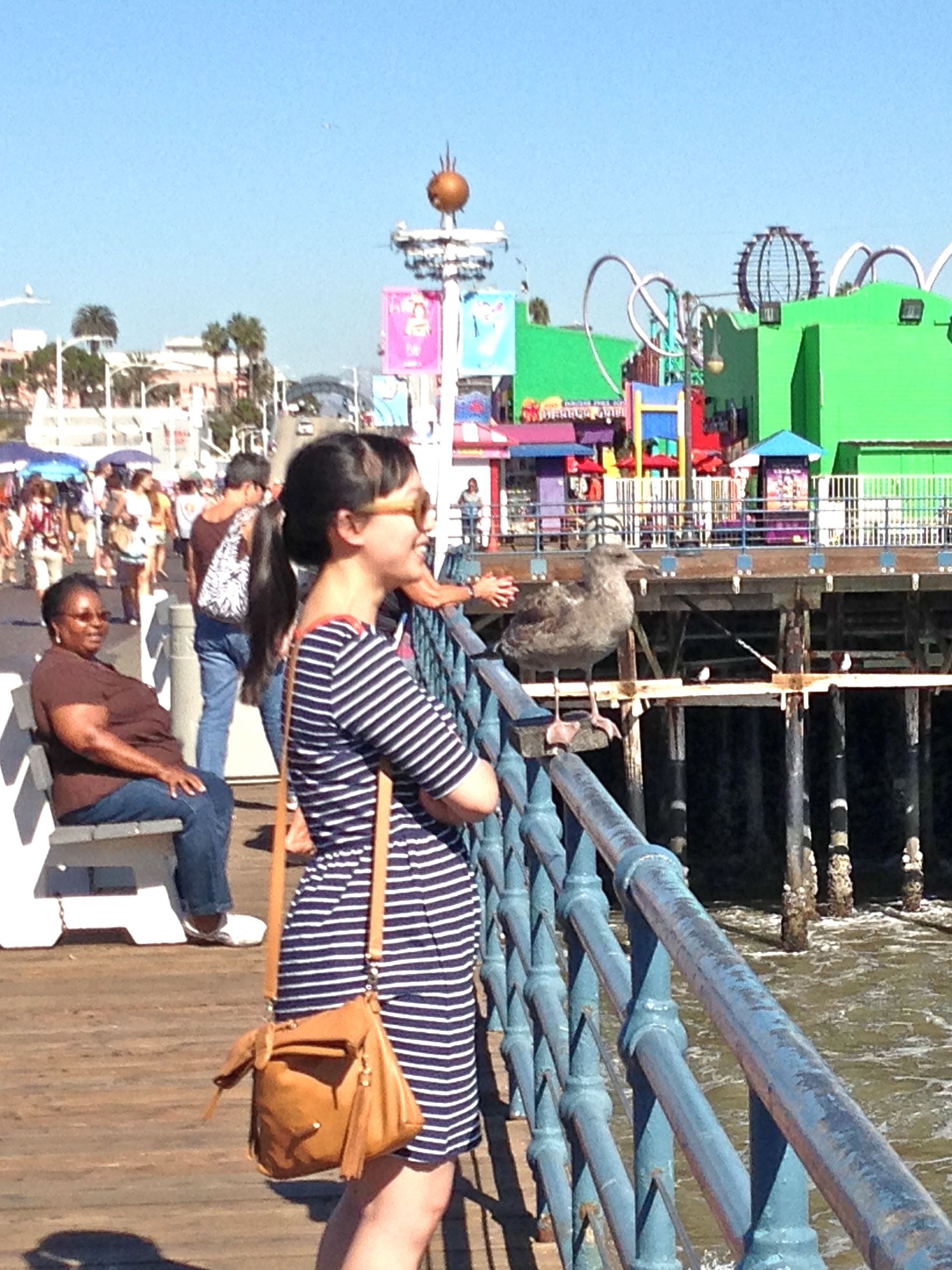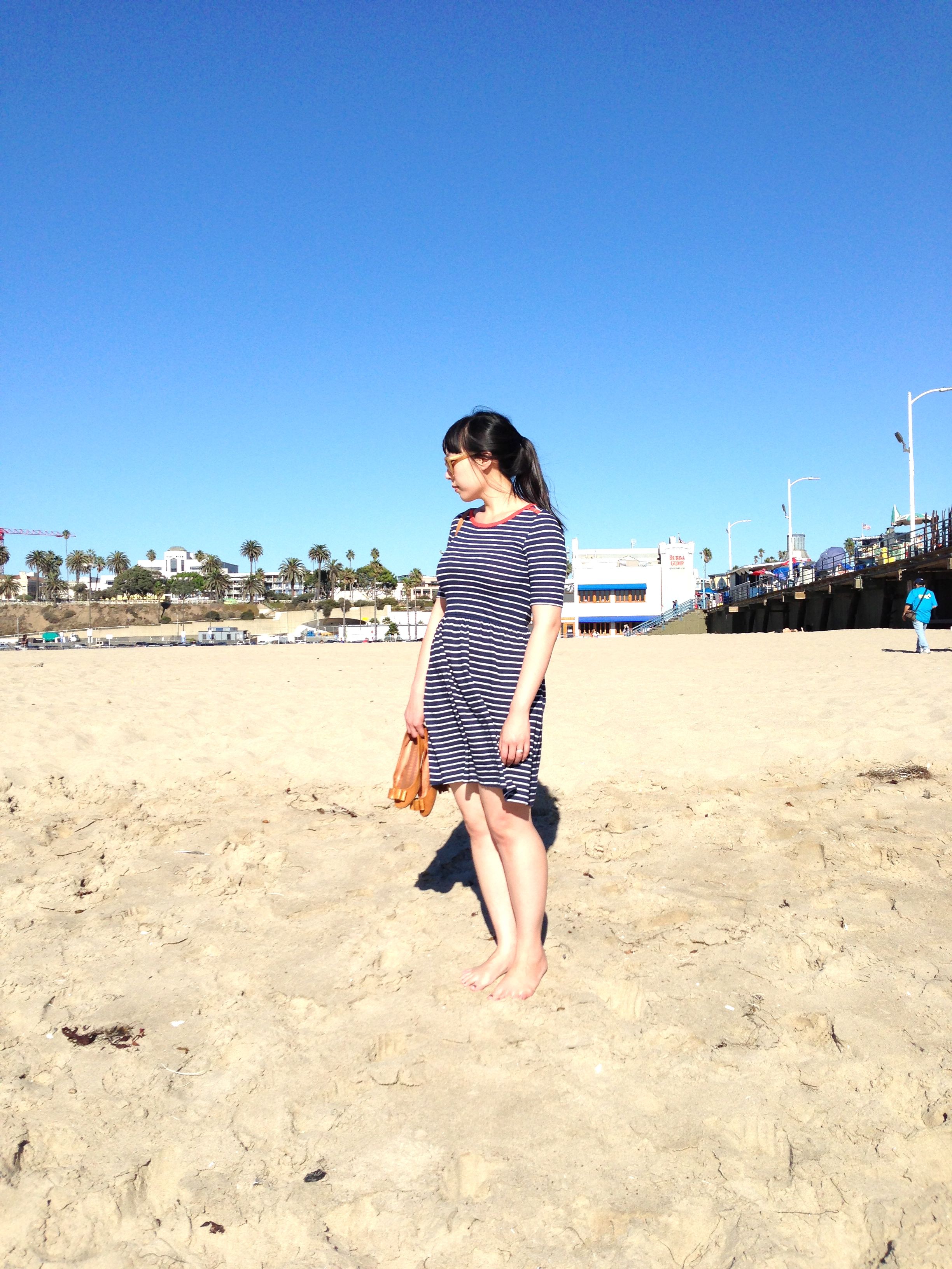 It’s what I call the “perfect” dress. Stripes – check! Pockets – check! Super comfy – check! Flattering – don’t mind if I say so! So I wore it everywhere, along the Hollywood Walk of Fame and then the next day also to Santa Monica Pier. For those of you from Western Australia, Santa Monica was possibly the closest-to-home experience I had in America. There was a large pier reminiscent of Busselton Jetty (but multiplied by about 100 and add two strange buskers – a black singing Willy Wonka???), a sandy beach (like Cottesloe except strangely manicured to be flat and duneless), and of course we had fish and chips for lunch! Good thing that dress is stretchy…