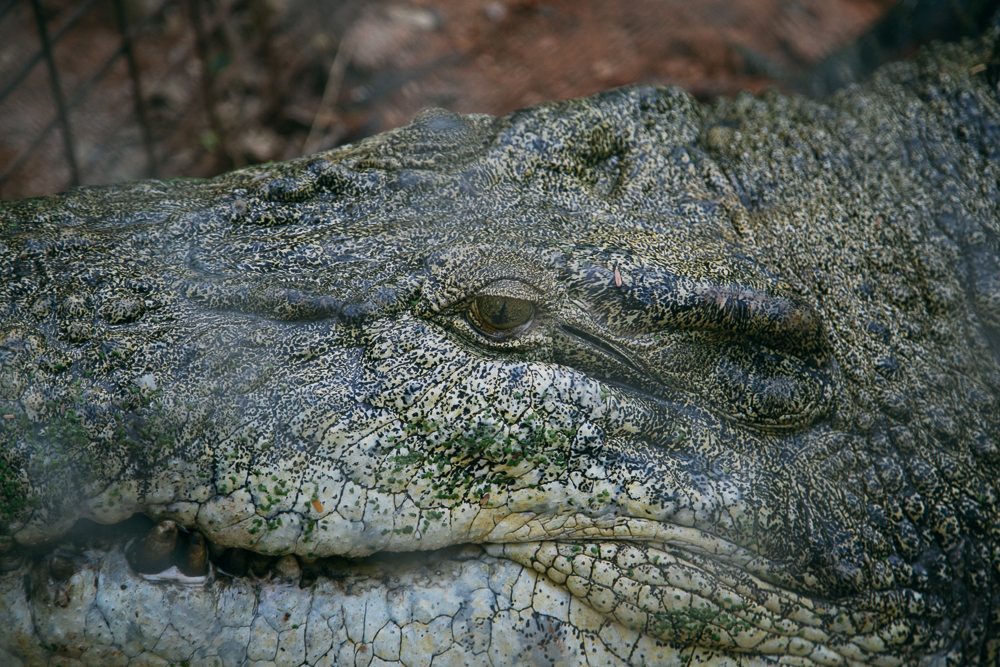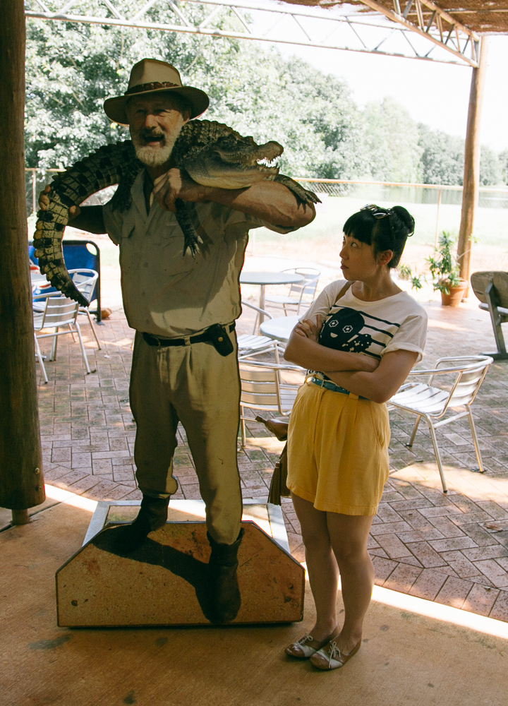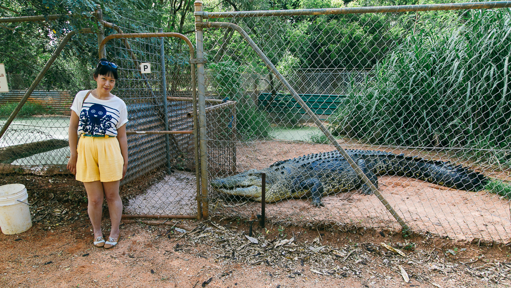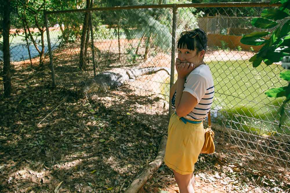 I’m writing this really quickly because the longer I look at these pictures, I get a rising sense of impending doom and start experiencing palpitations. The tour at Malcolm Douglas’ Crocodile Park starts off with a little wander around the park on your own, meeting the cute feathered and fluffy inhabitants of this park, which lulls you into a rather false sense of happiness and oh-isn’t-Australia’s-fauna-just-so-beautiful-and-BENIGN. Everyone then gathers to the main pond where you pass around the most gorgeous baby crocodiles (of course with their mouths deftly tied shut to save you from certain digit amputation) and once again everyone coos and poses smiling with the tiny reptilian offspring. They’re surprisingly soft to the touch! In the nearby algae-covered pools, you start to see that the surface of the water is actually patterned with the ridges of many spines, just lying in wait.