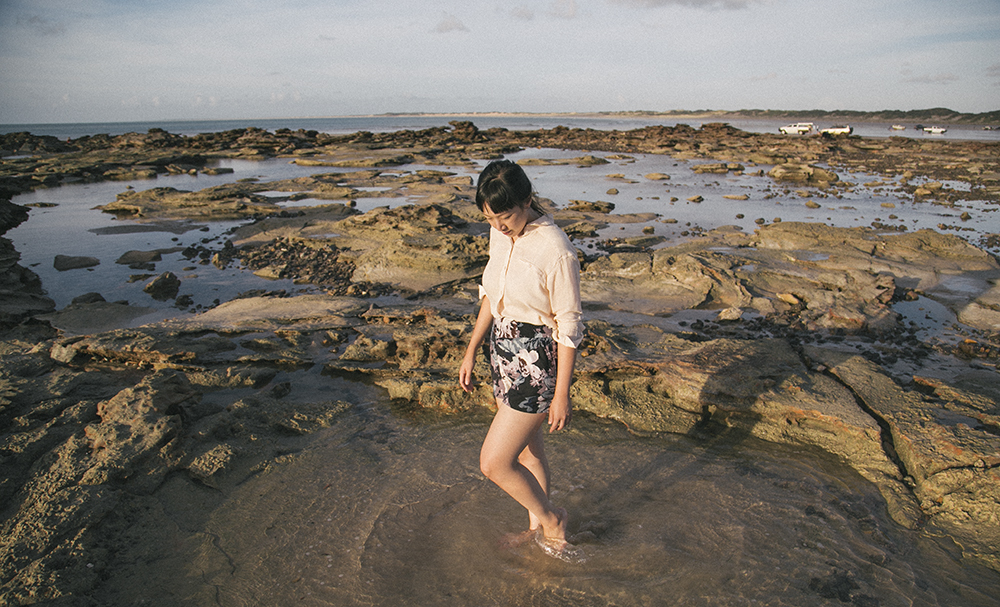Excuse the tatty hair in these photos – Jinn had just touched down in Broome, I’d come straight from work after spending a rather sweaty day travelling back from Kununurra, and rather than going back to my apartment to set his bags down and rest he said, “Allons-y!” So off to Cable Beach we went to catch the sunset! So this little shoot was pretty impromptu but we couldn’t help but take advantage of the peachy skies offsetting my totally unplanned peachy outfit. 🙂
