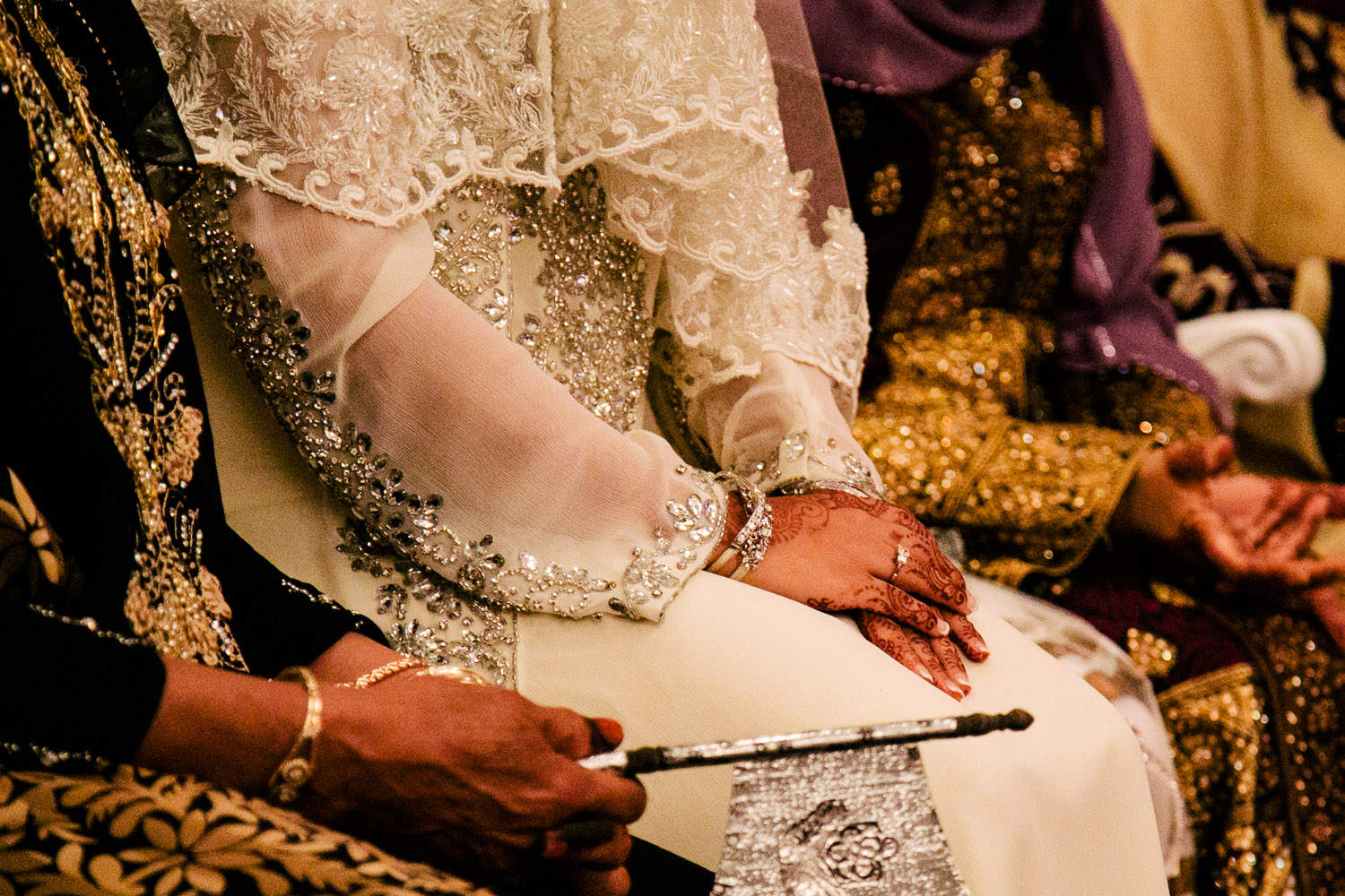 The hands and richly embroidered garments of three women. Mother-in-law, bride and her mother. White, universally symbolic of pureness of heart and devotion. Hands dipped and decorated to reflect the deep religious and cultural traditions that ceremonialise this marriage. They are dyed with the runes of blessings.