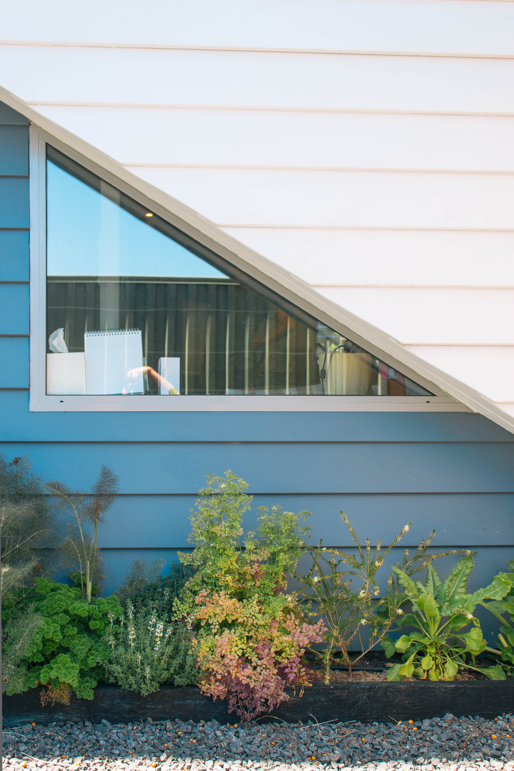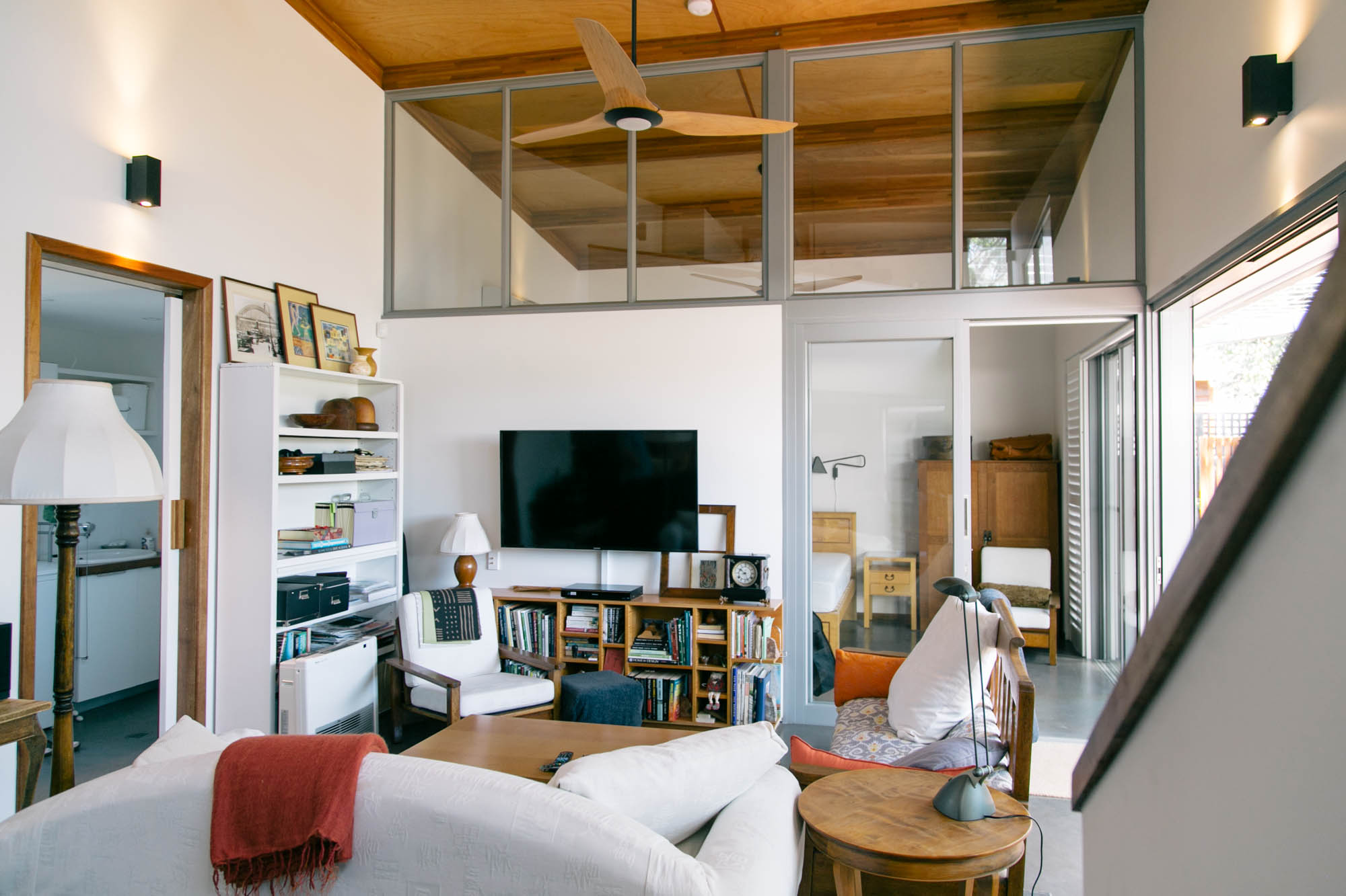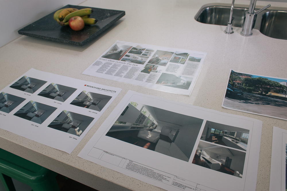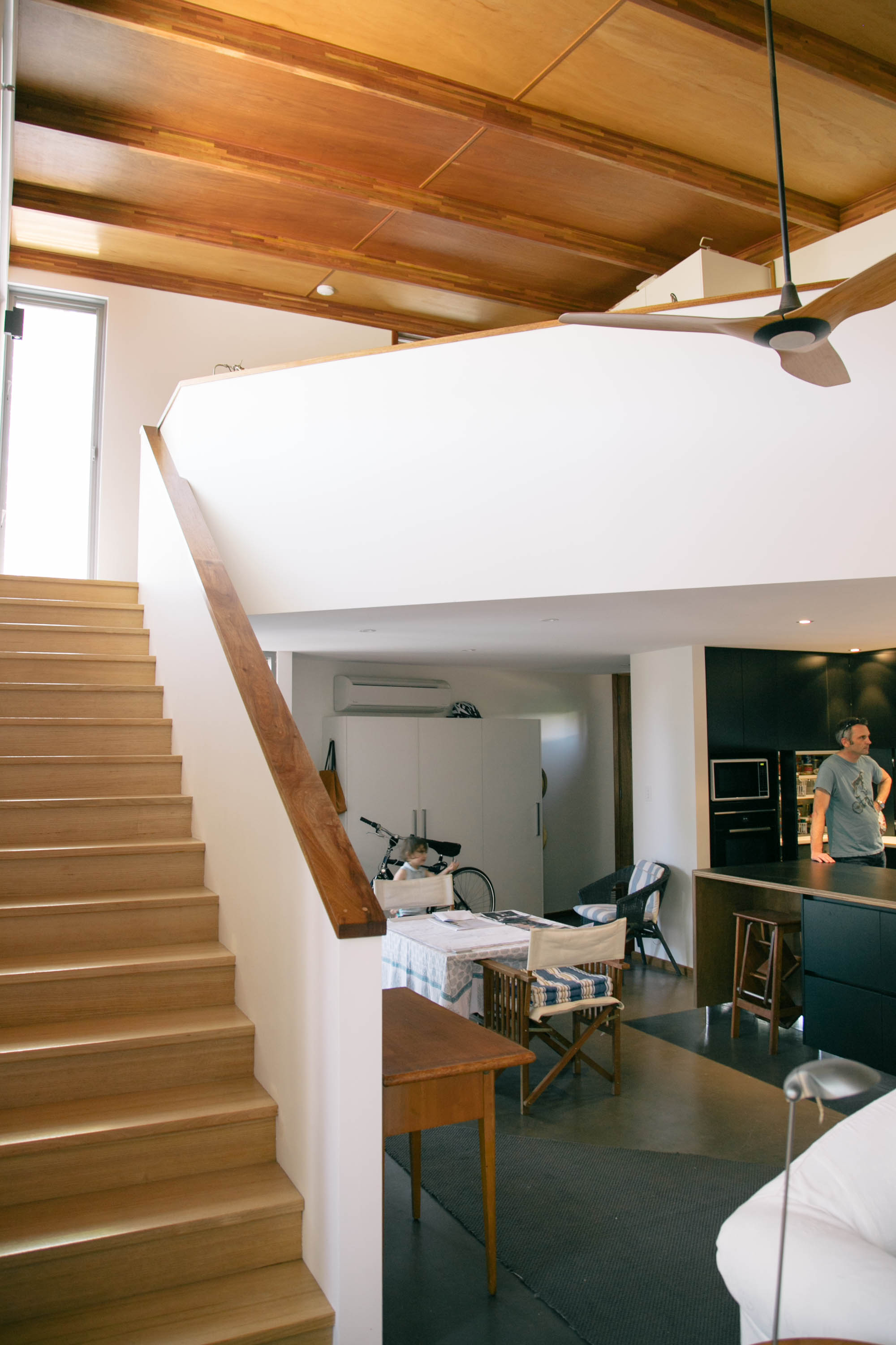 The first destination we visited for Open House Perth was this amazingly well designed house by Mountford Architects. Located in a semi-industrial area of Maylands, this home maximises its space by utilising a simple, elegant design which allows cross ventilation and easy access to the garden. The widespread use of louvred windows allows light and breeze to permeate the house (and also form cool-looking rainbow reflections on the walls!). There is a single pitched roof over the home which causes hot air to rise to the top of the house, where it is vented through an open window, thereby cooling the house. In addition the house enhances its environmental credentials with solar panels and a grey water system for the garden (definitely something to think about for our place!).