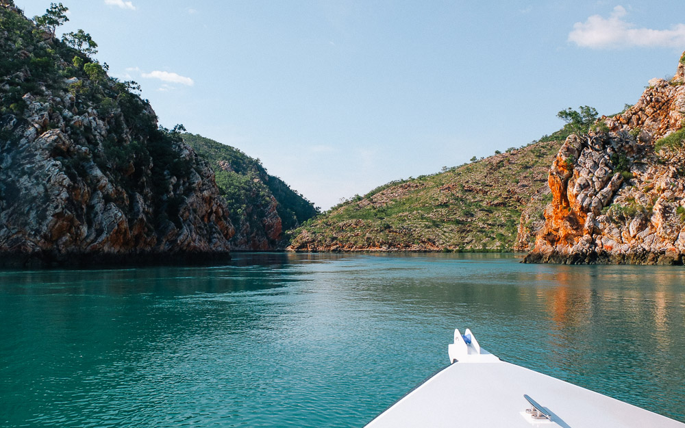 Quietly floating down one of the pristine creeks in the area, beautifully coloured rock formations reveal the layers of time. We stayed silent, hoping to catch a glimpse of a sun-baking saltwater crocodile. The waters were rich with wildlife, multitudes of fish, and who could fail to spot the sharks that seemed to knowingly circle the houseboat.