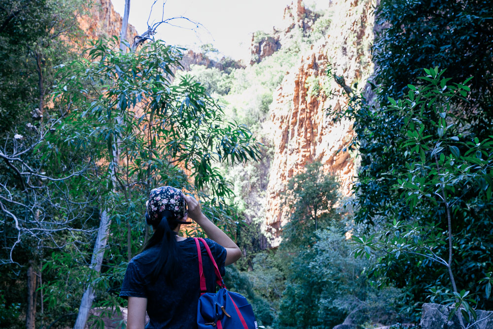 The mini hike into Emma Gorge was as fun as it was rewarding! After our morning seeping in the luscious waters of Zebedee Springs (read about it here) we decided it was time to limber up and get active. Yes, there is a “path” of sorts and the way is marked, but this walk is not exactly your typical Sunday stroll. Imagine clambering over slippery rocks and tip-toeing across creeks, all the while trying to remember to look up ever so often to enjoy the greenery and incredible rock faces that surround you. The gorge ends with an icy (and I mean icy) natural pool where you can have a well-earned swim and wash away the sweat and red dust. I must admit, it was so so very cold and I didn’t last long. But I contented myself to laze on the nearby rocks that had been warmed by the sun, listening to a group of children splashing around, seemingly immune to the chilly water.