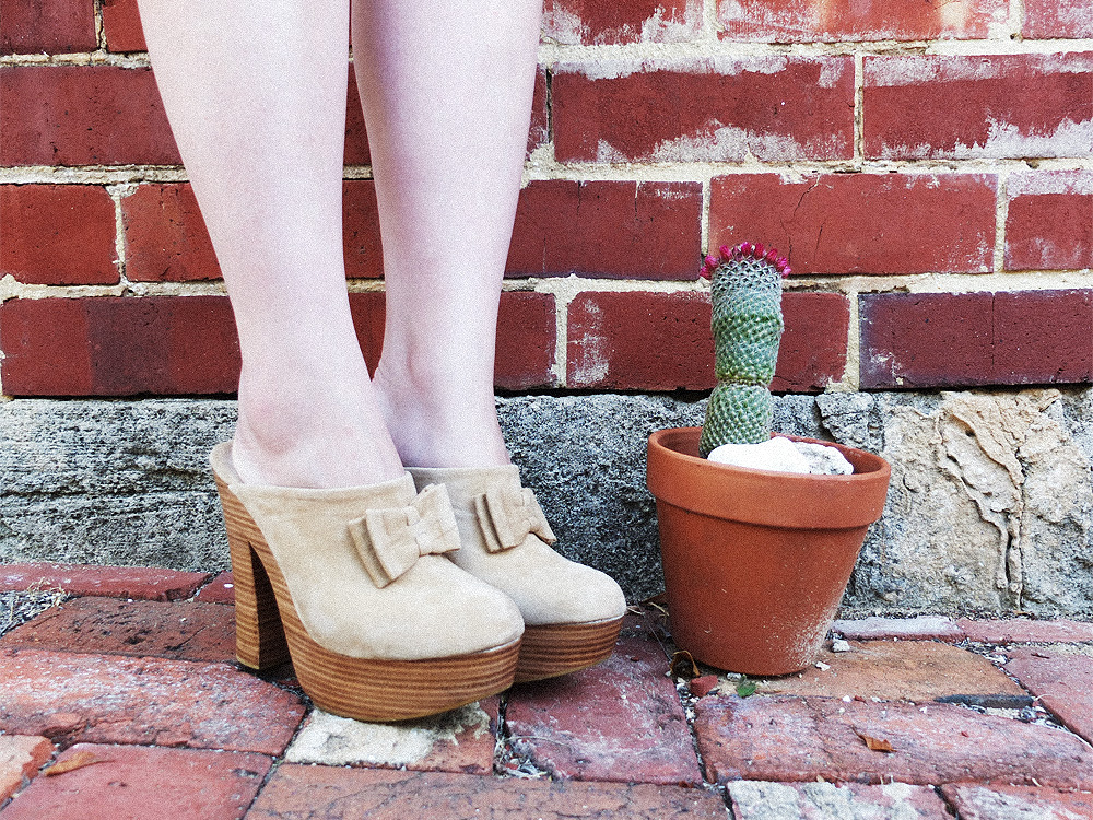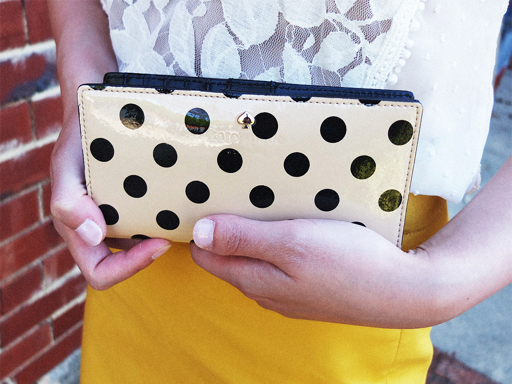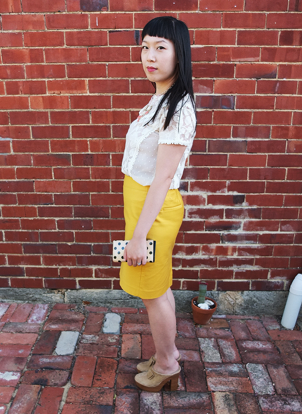 ***What I’m wearing – cream lace top by Madewell (yes, I have a thing for cream lace tops, I have about seven in various cuts/lengths/lace designs), yellow pencil skirt by J. Crew (Omg on sale right now, and in other awesome colours too! I want the jade one…), suede bow clogs by May (similar here and here), rose and gem necklace by Anthropologie, polka dot wallet by Kate Spade