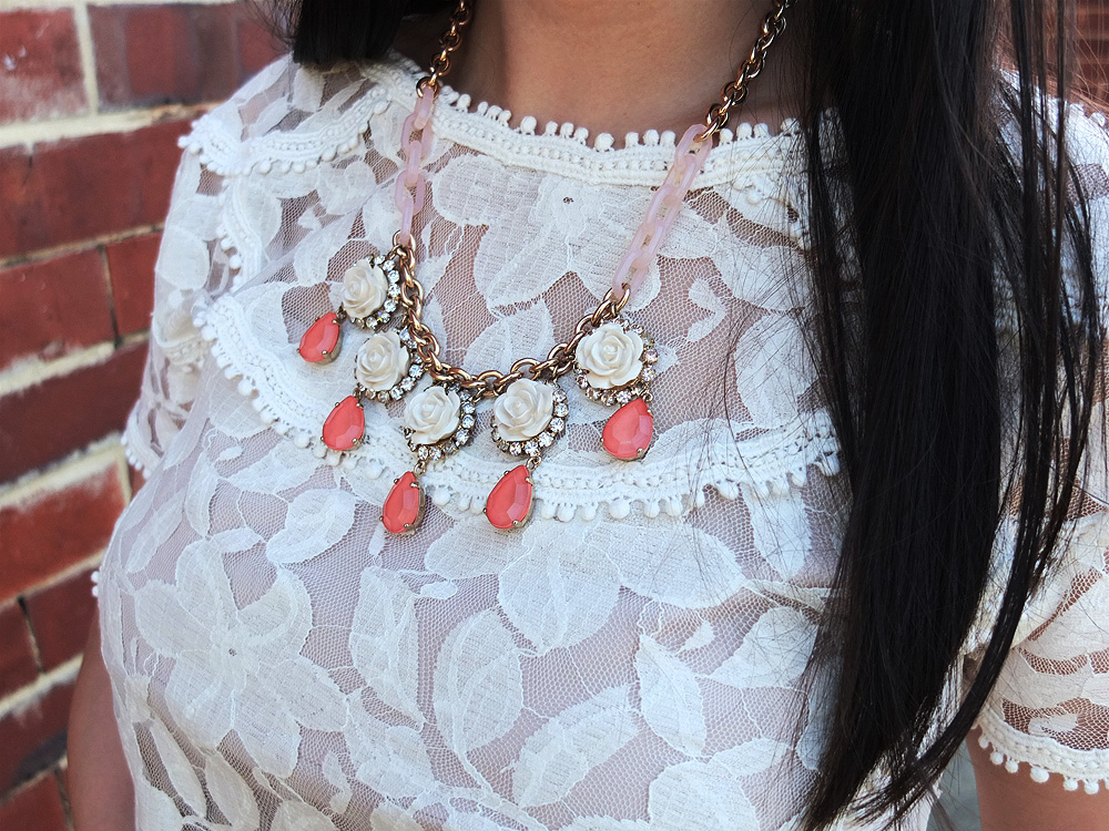 ***What I’m wearing – cream lace dress by Madewell (similar), colourful beaded necklace from Ruck Rover, pink leather sandals by The Horse