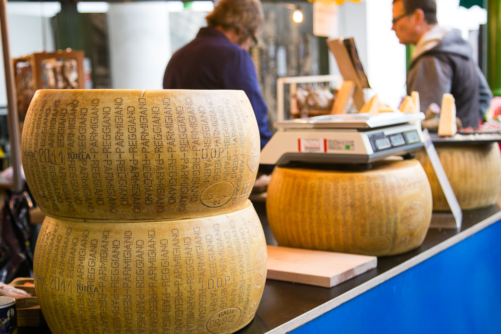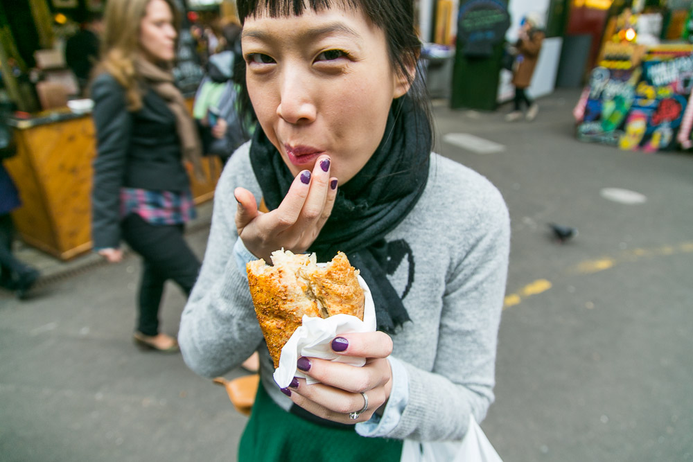 I’d been researching the whereabouts of good flea markets in London and the name “Borough Market” kept popping up here and there as a really popular place to go, but I kept dismissing it as it was a food market rather than a place to rummage for antique gems or vintage duds, which is what I was originally after. After our visit to The Shard we were making our way back to the tube station, down a little lane being buffeted by the bitingly cold wind, when I saw a sign for the Borough Market! (Haaaallelujah!) It’s essentially almost right at the base of the monumental building, and was just what we were after since we were both starving and it had turned out to be a bit of a grey, miserable day. And what better to pick up your spirits than a piping hot brownie fresh from the oven?
