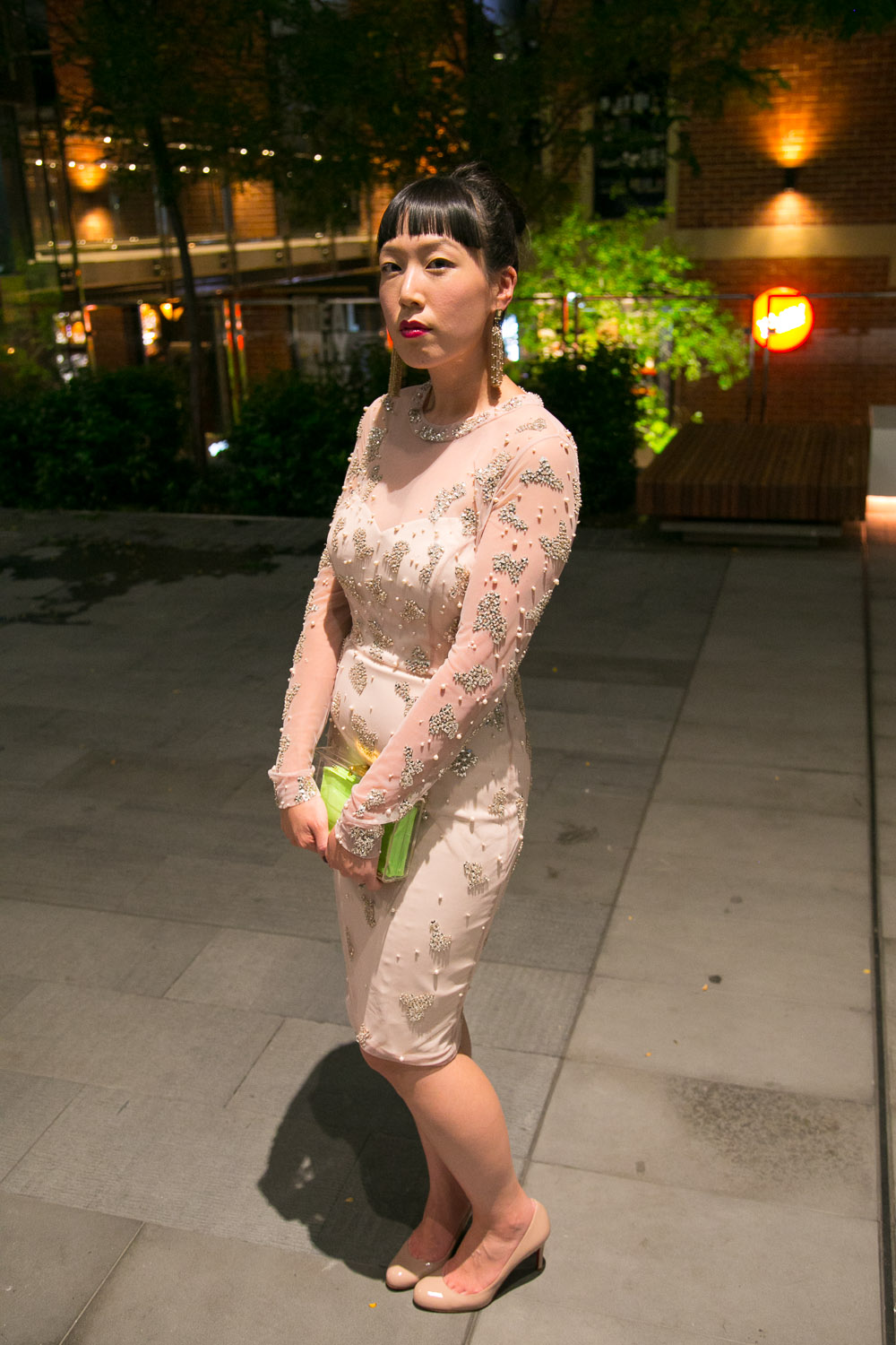 As promised, here’s a look at what I wore to my 30th birthday celebration! I’d been obsessing over this Rachel Gilbert dress from afar for quite some time (2226km to be exact!) and couldn’t wait for the chance to try it on. I had my heart set on wearing this (as you would have seen here) and had already started conjuring up how I would style it but also didn’t want to get my hopes up too high in case there was something amiss with the fit or colour and that my poor little heart would be broken. I had absolutely nothing to fear as I tried it on in store – it fit like a glove! I absolutely fell in love with the combination of the sweetheart neckline and fitted pencil silhouette and most of all the sheer netting encrusted with pearls and sequins. Just the right amount of bling. 🙂