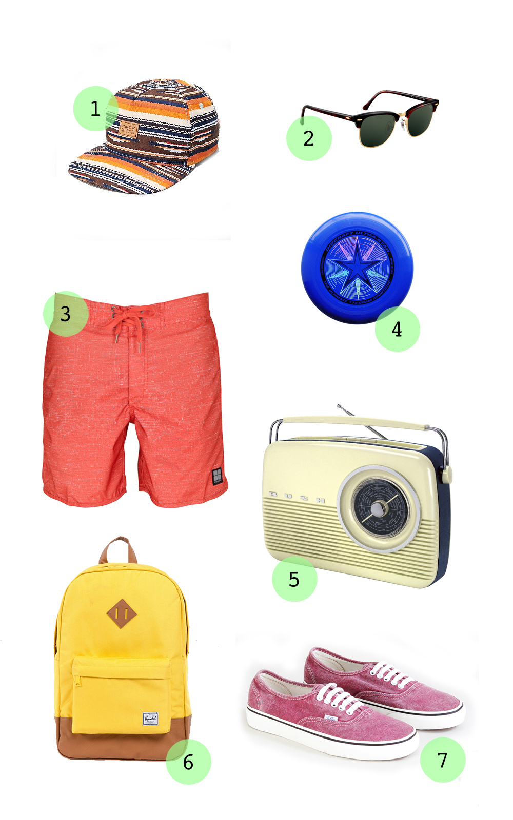***1. Obey San Juan Snapback, 2. Ray-Ban Clubmaster sunnies, 3. Unstatic board shorts, 4. Discraft frisbee disc, 5. Bush portable digital radio, 6. Herschel backpack (on sale!!), 7. Vans Authentic Rio Red sneakers