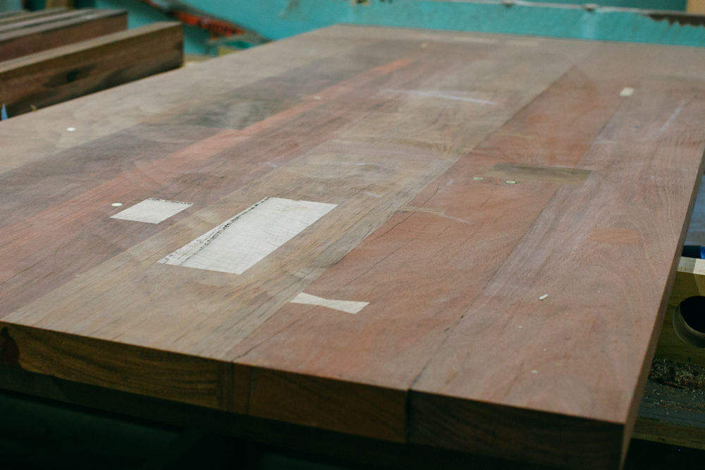 In the workshop, we’re surrounded by many pieces of wood in a multitude of tones and shapes, all awaiting their new calling in life. Currently in the pipeline are some magnificent benches for Cranmore Home made from timber reclaimed from an old dam in WA’s southwest region. There are other equally stunning pieces, including an almost-finished dining table with multiple perfect inlays (the kind that I call bow ties but have since learnt are called Dutchman wood joints) and brass accents. Said table would have come home with me if I drove a ute rather than a hatchback and had some extra dosh. But that’s okay, our time will come.